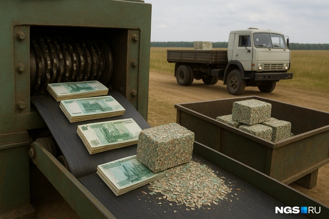 Каждый брикет — это определенная сумма денег в эквиваленте измельченных купюр определенного достоинства. Например, если нашинковать пятитысячные купюры, то брикет — это миллион рублей, если перемолоть тысячи — примерно 200 тысяч рублей. В каждом наполненном контейнере примерно 400 килограмм «денежного фарша» в брикетах.
